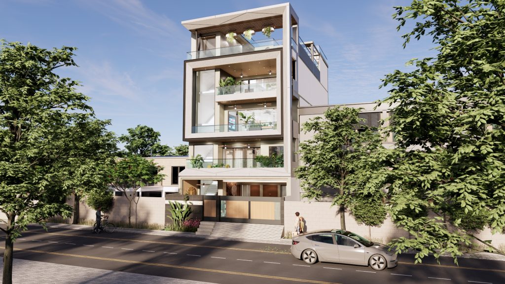 A thoughtfully designed multi-generational home that blends a professional eye clinic on the ground floor with elegant private living spaces above—crafted to offer privacy, functionality, and a timeless modern aesthetic.