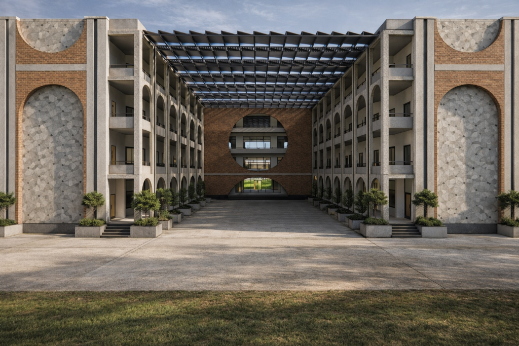 Education spaces are more than classrooms — they are environments that shape curiosity, creativity, and community. This recently designed school campus reflects a modern architectural vision rooted in symmetry, openness, and contextual materiality.